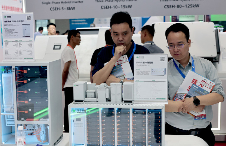 6月12日炒股配资平台官方,第十八届国际太阳能光伏和智慧能源&储能及电池技术与装备(上海)展览会在国家会展中心(上海)举行。图为参观者在一组储能设备模型展品前驻足观看。(新华社)